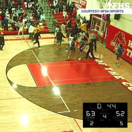 The game was called off immediately, with Half Hollow Hills West leading 63-52. Both teams left the gym without finishing the final seconds.
